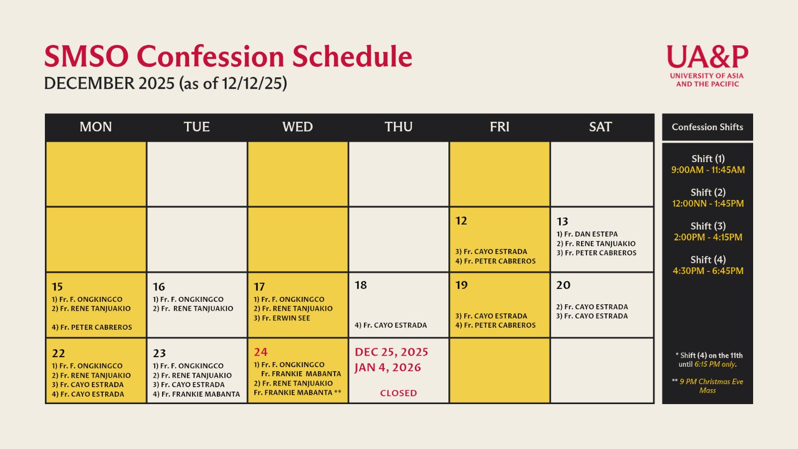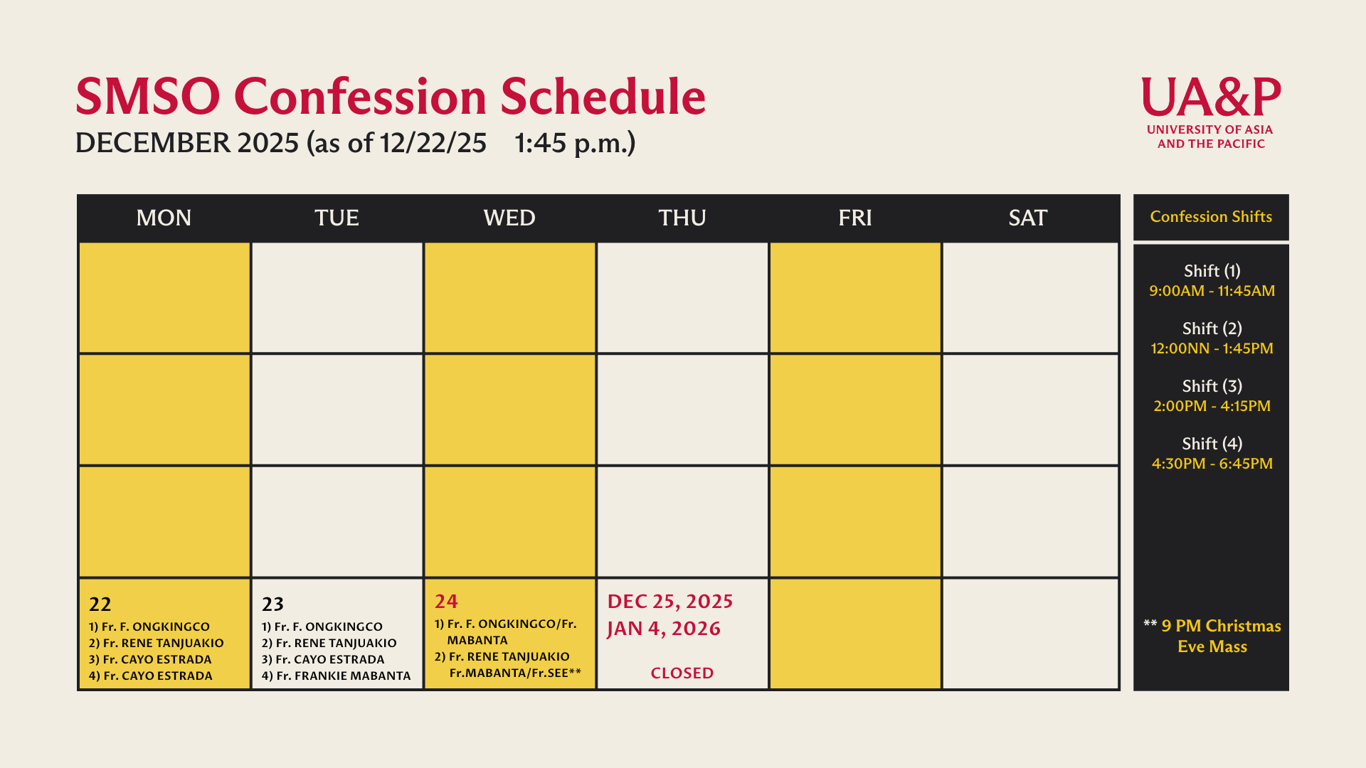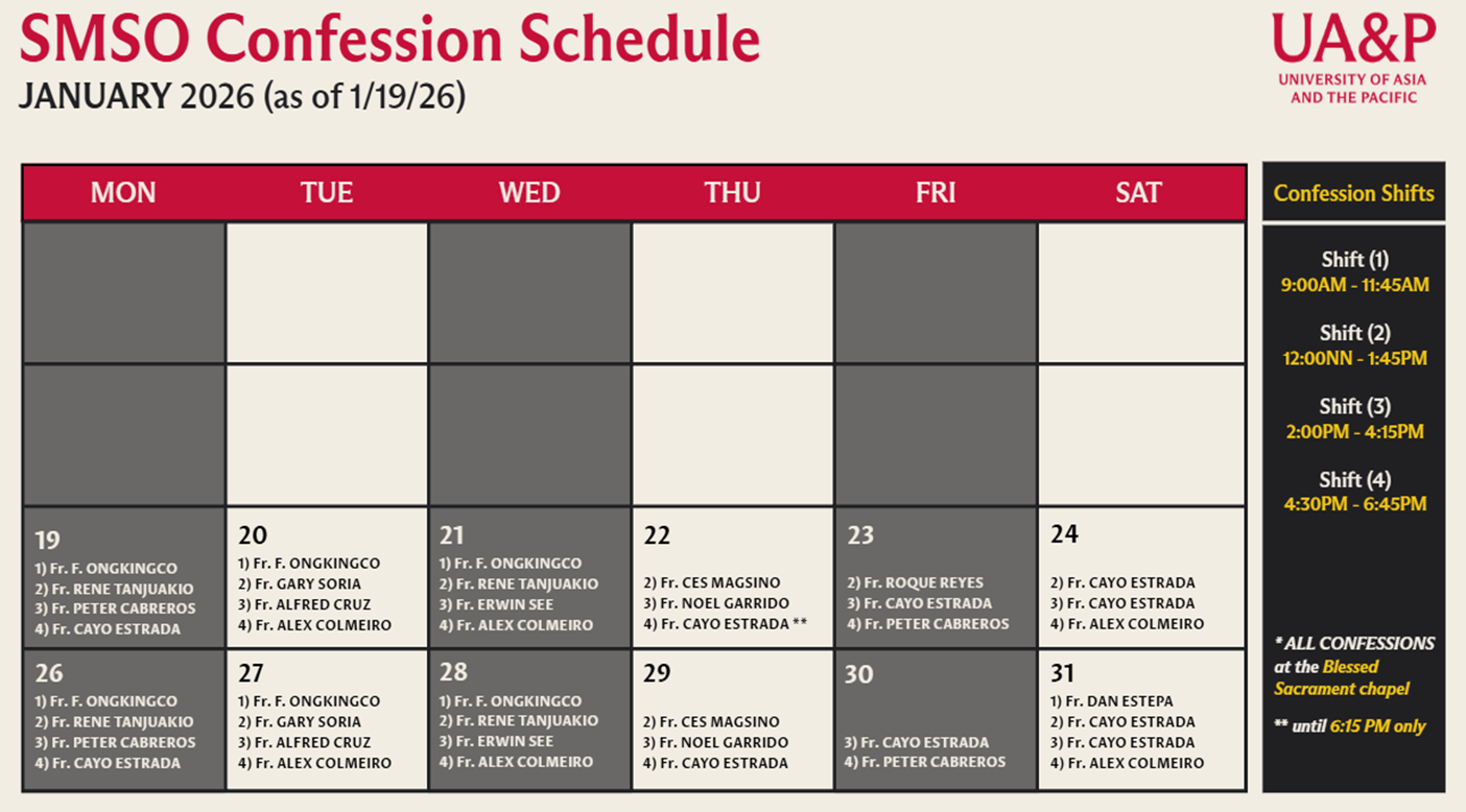 The Sancta Maria Stella Orientis Oratory honors Holy Mary, “Star of the Orient,” serving as the visible heart of the University. Fondly called by a shorter name, “Stella Orientis,” the chapel is housed on the second floor of UA&P’s Development Communication Building, and was blessed on the Solemnity of the Assumption of the Blessed Virgin Mary, 15 August 1992.
